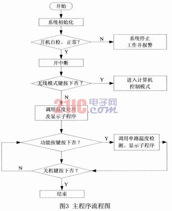 係(xi)統(tong)上(shang)電(dian)後(hou)單(dan)片(pian)機(ji)首(shou)先(xian)進(jin)行(xing)係(xi)統(tong)初(chu)始(shi)化(hua),之(zhi)後(hou)程(cheng)序(xu)執(zhi)行(xing)相(xiang)應(ying)的(de)自(zi)檢(jian)子(zi)程(cheng)序(xu),檢(jian)測(ce)測(ce)溫(wen)係(xi)統(tong)是(shi)否(fou)有(you)故(gu)障(zhang)。係(xi)統(tong)默(mo)認(ren)進(jin)入(ru)的(de)單(dan)機(ji)工(gong)作(zuo)模(mo)式(shi),在(zai)單(dan)機(ji)工(gong)作(zuo)模(mo)式(shi)下(xia),可(ke)以(yi)根(gen)據(ju)功(gong)能(neng)按(an)鍵(jian)選(xuan)擇(ze)不(bu)同(tong)的(de)功(gong)能(neng),通(tong)過(guo)係(xi)統(tong)調(tiao)用(yong)相(xiang)應(ying)的(de)功(gong)能(neng)按(an)鍵(jian)處(chu)理(li)子(zi)程(cheng)序(xu)來(lai)完(wan)成(cheng)應(ying)的(de)功(gong)能(neng),並(bing)在(zai)LED數碼管上顯示相應的溫度信息,具有非常好的人性化特點;在zai無wu線xian工gong作zuo模mo式shi下xia,此ci時shi係xi統tong作zuo為wei一yi個ge下xia位wei機ji,可ke以yi和he遠yuan程cheng計ji算suan機ji進jin行xing無wu線xian通tong信xin,實shi現xian數shu據ju的de遠yuan距ju離li傳chuan輸shu,利li用yong計ji算suan機ji強qiang大da的de信xin息xi處chu理li功gong能neng,把ba下xia位wei機ji傳chuan送song過guo來lai的de數shu據ju進jin行xing分fen析xi和he處chu理li。