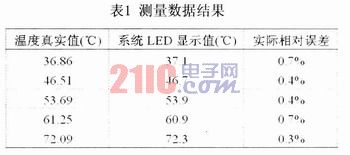 試shi驗yan數shu據ju通tong過guo對dui普pu通tong熱re水shui器qi加jia熱re中zhong的de水shui溫wen進jin行xing測ce量liang取qu得de,測ce量liang中zhong采cai用yong實shi驗yan用yong高gao精jing密mi數shu字zi測ce溫wen儀yi的de示shi值zhi溫wen度du作zuo為wei被bei測ce物wu體ti溫wen度du檢jian測ce點dian的de溫wen度du真zhen實shi值zhi,本ben測ce溫wen裝zhuang置zhi測ce得de的de溫wen度du信xin息xi經jing過guo電dian路lu的de轉zhuan換huan及ji單dan片pian機ji的de處chu理li後hou,測ce得de的de溫wen度du信xin息xi在zaiLED數碼管上的顯示值如表l所示。從表中的數據可以看出,本係統LED顯示值和真實值很接近;試驗過程中,由於測量環境及其它因素的影響,使得係統的測量值在真實值上下波動,但溫度的實際相對誤差始終保持在1%以內,從而證明了本測溫裝置完全能夠滿足實際的測量要求。
