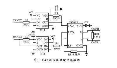 CAN通訊網絡模塊負責將啟動信號和檢測信號通過CAN網傳輸給汽車的中央處理器。中央處理器通過接收的信號做決策判斷。CAN總線通信方式靈活、抗幹擾能力強,目前在汽車控製係統中應用廣泛。CAN通訊接口硬件設計如圖3所示,其中82C250是CAN控製器和物理總線間的接口,它和CAN控製器之間采用光隔P113來提高係統的抗幹擾能力。