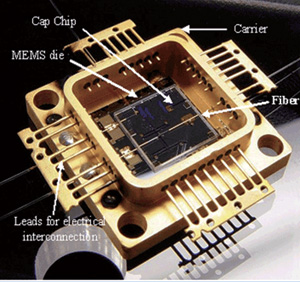 圖3微型光機械係統(MOEMS)交換器件的管芯被4條光纖和連接線連接,並封裝在工業標準的Covar金屬封裝內