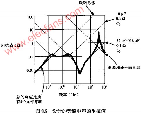 上式計算了圖8.9中電容C2和電容陣列C3的曲線。圖8.9中假設C2和C3電容陣列的每個元件的ESR都為0.1歐,總的電路板麵積為10IN的2次方,電源的和地之間有0.01IN厚的FR-4電介質。