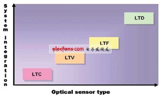 一旦根據轉換類型、速率以及光譜響應縮小了選擇範圍,最後的選擇就要基於其他標準,比如封裝類型、溫度範圍,當然還有成本。典型的工作溫度範圍是商用(0~70℃),工業用(-40~85℃),汽車(-40~105℃)以及軍用(-55~125℃)通常,成本與矽的尺寸成正比。並且,矽基尺寸越大,成本越高。光的應用傾向於更高的係統集成,見圖1,集成度越高,傳感器的複雜度越高,但各部件對應用所起的作用卻越低。
