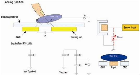 盡jin管guan觸chu摸mo傳chuan感gan器qi的de操cao作zuo細xi節jie和he接jie口kou依yi賴lai於yu具ju體ti的de應ying用yong,一yi般ban來lai說shuo,容rong性xing傳chuan感gan器qi接jie口kou電dian路lu和he檢jian測ce方fang法fa有you模mo擬ni和he數shu字zi兩liang種zhong類lei型xing。一yi種zhong模mo擬ni技ji術shu是shi測ce量liang頻pin率lv或huo工gong作zuo周zhou期qi,這zhe些xie量liang因yin為wei在zai手shou指zhi和he地di之zhi間jian引yin入ru額e外wai的de電dian容rong而er發fa生sheng變bian化hua(見圖2)。