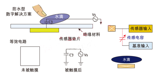 圖2:模擬觸摸方案;由於需使用參考地,可能會受到水滴的影響。