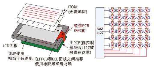 圖5:使用FMA1127實現的觸摸屏及PCB和觸摸屏的疊層安排。利用TDC比較由檢測電容形成RC延時線與基準RC延時線的延時差別。使用差動信號消除或降低了相關/相幹噪聲源的影響,無需地層。