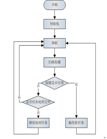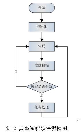 圖2是shi一yi個ge具ju有you休xiu眠mian功gong能neng的de典dian型xing係xi統tong軟ruan件jian流liu程cheng圖tu。係xi統tong初chu始shi化hua後hou進jin入ru休xiu眠mian模mo式shi,經jing過guo一yi段duan時shi間jian的de延yan時shi後hou喚huan醒xing掃sao描miao按an鍵jian模mo塊kuai,進jin行xing按an鍵jian掃sao描miao。如ru果guo有you按an鍵jian按an下xia,軟ruan件jian判pan斷duan是shi否fou有you效xiao。如ru果guo無wu效xiao按an鍵jian按an下xia,那na麼me係xi統tong繼ji續xu進jin入ru休xiu眠mian模mo式shi。如ru果guo軟ruan件jian判pan斷duan按an鍵jian有you效xiao,那na麼me喚huan醒xing係xi統tong,觸chu發fa任ren務wu處chu理li進jin程cheng。當dang處chu理li完wan所suo有you任ren務wu後hou,係xi統tong又you重zhong新xin進jin入ru休xiu眠mian狀zhuang態tai。這zhe是shi個ge典dian型xing的de具ju有you休xiu眠mian功gong能neng的de係xi統tong工gong作zuo流liu程cheng圖tu,它ta的de優you點dian就jiu是shi此ci軟ruan件jian流liu程cheng簡jian單dan易yi懂dong、容易實現,一般可以滿足大多數場合的應用。但是,如果係統任務處理消耗了較多的CPU處chu理li時shi間jian,那na麼me為wei了le達da到dao目mu標biao平ping均jun工gong作zuo電dian流liu,就jiu需xu要yao相xiang應ying增zeng加jia休xiu眠mian時shi間jian。同tong時shi降jiang低di了le按an鍵jian掃sao描miao的de頻pin率lv,從cong而er加jia長chang了le係xi統tong喚huan醒xing的de響xiang應ying時shi間jian。因yin此ci,此ci方fang法fa適shi合he比bi較jiao簡jian單dan的de、係統任務不複雜的應用。