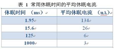 CY8C22x45係列芯片休眠時的工作電流僅有3uA[5],xinpianneibaohanyigexiumianjishuqi,xitongjinruxiumianhoujishuqikaishidijian,dangjishuzhiweilingshichanshengzhongduanhuanxingxitong。huanxingxitonghoukeyibuzuorenhechulizaicijinruxiumianmoshi。zheyangzhouerfushi,dadaosuoxuyaodezhenggexiumianshijian。zaishijishejizhong,changchangshiyongpingjunxiumiandianliutidaigongshi2中的Isleep,即在每次休眠結束後,僅讓係統正常工作最短時間,該時間內完成所有必須操作(僅是一次循環判斷),此時的電流即為該休眠時間下的平均休眠電流。表1列出了常用休眠時間的平均休眠電流。