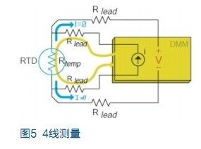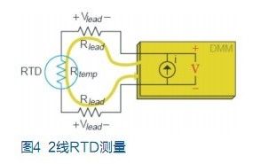 與熱敏電阻相似,鉑電阻溫度傳感器(RTD)也是用鉑製成的熱敏感電阻。當通過測量電壓計算RTD 溫度時,數字萬用表用已知電流源測量該電流源所產生的電壓。這一電壓為兩條引線(Vlead)上的壓降加RTD上的電壓(Vtemp)。例如,常用RTD 的電阻為100Ω,每1℃僅產生0.385Ω的電阻變化。如果每條引線有10Ω電阻,就將造成26℃的測量誤差,這是不可接受的。所以應對RTD作4線歐姆測量。