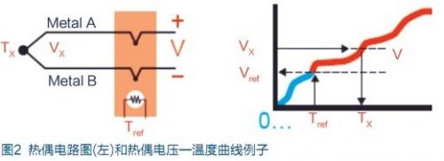熱電偶是溫度測量中最常用的傳感器。其主要好處是寬溫度範圍和適應各種大氣環境,而且結實、價低,無需供電,尤其最便宜。熱電偶由在一端連接的兩條不同金屬線(金屬A和金屬B)構成,如圖1所示。當熱電偶一端受熱時,熱電偶電路中就有電勢差。可用測量的電勢差來計算溫度。