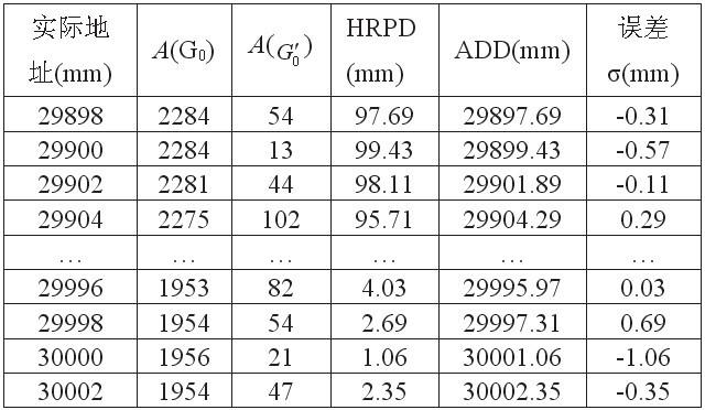 實驗方法:在編碼電纜任找一處反複移動天線箱,直至檢測到A(G''0)為最小,此時顯示地址為29.000m,以此處作為實際的29.000m。然後將天線箱在此附近每隔2mm移動一次,記錄每次所檢測的A(G0)和A(G''0),並根據檢測的數據計算出位置數據:HRPD、ADD。同理,在30.000m處作同樣測試。部分檢測數據和計算結果如表1所示.