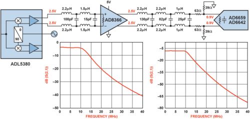 在ADL5380與AD6642間放置具有1.5 dB插入損耗的低通濾波器,從而濾除幹擾頻率成分。整個鏈路的輸入阻抗為50 Ω,輸出阻抗為500 Ω。采用這種配置,整個信號鏈的增益如下: