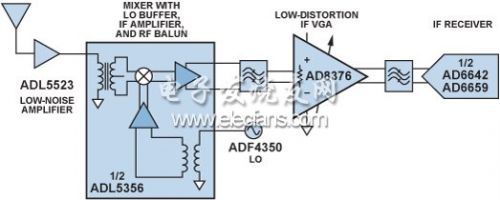 圖3顯示了超外差式接收機的一個通道,該器件采用以下元件:低噪聲放大器ADL5523具有LO緩衝器、IF放大器和RF巴倫的雙通道平衡混頻器 ADL5356;帶通或者低通濾波器;雙通道、超低失真IF VGAAD8376另一個低通或者帶通抗混疊濾波器;雙通道IF接收機AD6642