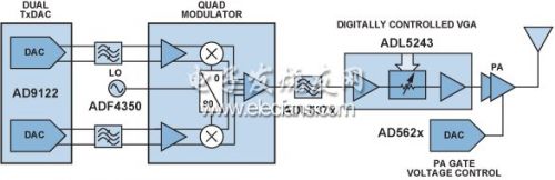 圖5顯示了超外差式或ZIF發射機,該器件采用以下元件:TxDACAD9122、低通濾波器、正交調製器ADL537x、另一個RF濾波器、頻率合成器ADF4350、數字控製VGAADL5243、功率放大器、用於控製功率放大器(PA)柵極電壓的DACAD562x.