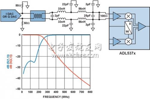 ADL5372的輸入電路需要0.5 V共模電壓,由流經50 Ω電阻的10 mA直流電流提供。0 mA至20 mA交流電流由兩個50 Ω電阻和一個100 Ω電阻共享。因此調製器輸入的交流電壓為20 mA × ((50 × 2) || 100) = 1 V p-p。TxDAC與調製器之間的濾波器用於去除高頻雜散和諧波成分。濾波器的輸入和輸出阻抗為100 Ω。完整接口如圖6所示。