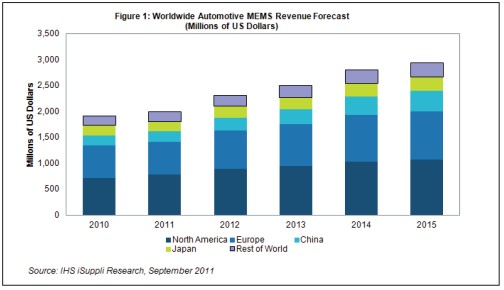 IHS iSuppli公司發布最新汽車MEMS報告,報告顯示:中國的汽車微機電係統(MEMS)市場未來幾年增長速度將快於世界其它任何地區。進一步實施汽車安全法規,以及加大降低汽車碳排放的力度,將促進中國汽車MEMS市場的增長。