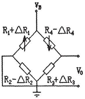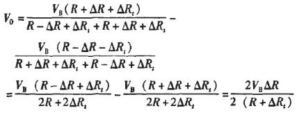 如圖2傳感器輸出電壓信號Vo=VB△R/R(R1=R2=R3=R4,△R1=△R2=△R3=△R4),在zai理li想xiang狀zhuang態tai下xia其qi信xin號hao輸shu出chu是shi一yi個ge線xian性xing變bian化hua值zhi。但dan是shi單dan晶jing矽gui材cai料liao的de傳chuan感gan器qi屬shu於yu半ban導dao體ti傳chuan感gan器qi其qi受shou溫wen度du的de影ying響xiang比bi較jiao大da。這zhe使shi得de傳chuan感gan器qi在zai環huan境jing溫wen度du變bian化hua時shi輸shu出chu呈cheng現xian變bian化hua,影ying響xiang讀du出chu精jing度du。對dui圖tu2的電橋加入溫度對電橋的影響得出下式: