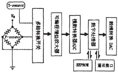 在溫度傳感器的輔助作用下通過信號轉換開關分時讀取壓力與溫度的數值,通過可編程增益放大器將微弱信號放大,再經過ADC量化傳感器的信號進入數字處理器計算當前溫度和壓力下的補償後壓力輸出給數模轉換DAC輸出模擬信號。而溫度補償則可以通過通訊接口將參數寫入EEPROM供數字處理器計算時調用。如此多的功能部件均可集成製作在一塊單一芯片上,使得ASIC電路很容易和MEMS技術製作的壓力敏感芯片封裝在一個小巧的殼體中。
