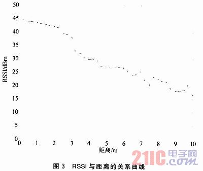 在相同的實驗平台下,在0~10 m的範圍內,每間隔0.2 m或者0.3 m記錄RSSI值,每個距離均接收100個左右的數據包,對RSSI先進行均值處理,然後得出RSSI值與距離的關係曲線如圖3所示。
