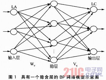 BP網絡是神經網絡中采用誤差反傳算法作為其學習算法的前饋網絡,通常由輸入層、輸出層和隱含層(一層或多層)構成。層與層之間的神經元采用全互連的連接方式,通過相應的網絡權係數w相互聯係,每層內的神經元之間沒有連接。圖1所示為具有一個隱含層的BP網絡模型。其中:LA為BP神經網絡的輸入層,LB為隱層,LC為輸出層,Wir為隱層與輸入層的權值,Vrj為輸出層與隱層的權值。