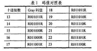 編碼采用格雷碼(Gray)為數值碼,以某一固定碼寬為參考碼R,它用於標尺定位和提高精度。Gray碼是一種絕對編碼方式的無權碼,它所具有的循環、單(dan)步(bu)特(te)性(xing)能(neng)消(xiao)除(chu)隨(sui)機(ji)取(qu)數(shu)時(shi)出(chu)現(xian)重(zhong)大(da)誤(wu)差(cha)的(de)可(ke)能(neng),其(qi)任(ren)意(yi)兩(liang)個(ge)柏(bai)鄰(lin)整(zheng)數(shu)之(zhi)間(jian)轉(zhuan)換(huan)時(shi),隻(zhi)有(you)一(yi)個(ge)位(wei)數(shu)發(fa)生(sheng)變(bian)化(hua),大(da)大(da)減(jian)少(shao)了(le)由(you)一(yi)個(ge)狀(zhuang)態(tai)轉(zhuan)到(dao)下(xia)一(yi)個(ge)狀(zhuang)態(tai)時(shi)的(de)邏(luo)輯(ji)混(hun)淆(xiao),具(ju)有(you)較(jiao)強(qiang)的(de)容(rong)錯(cuo)能(neng)力(li)。以(yi)6位編碼為例,其部分十進製數與Gray碼的一一對應關係如表1所示。