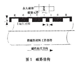 采用圖1所suo示shi的de測ce量liang結jie構gou,其qi中zhong被bei測ce工gong作zuo部bu件jian要yao求qiu屬shu於yu鐵tie磁ci性xing材cai料liao。文wen獻xian中zhong指zhi出chu在zai固gu定ding的de磁ci場chang中zhong,表biao麵mian變bian化hua的de曲qu率lv越yue大da,引yin起qi的de周zhou圍wei磁ci場chang,變bian化hua也ye越yue大da。為wei了le使shi磁ci場chang的de影ying響xiang最zui大da,選xuan用yong凹ao槽cao作zuo為wei測ce罩zhao標biao誌zhi,以yi單dan位wei寬kuan度du(bmm)的凹槽表示“0”或碼元間隔,單能寬度的“凸槽”表示“1”,兩倍單位寬度的“凸槽”表示標誌位R。在工作部件表麵,按上述的編碼規則加下出一係列凹槽,然後噴塗上非磁性材料,形成磁性標尺。圖1所示的磁性標尺表示Gray碼01 1010碼區,黑色部分表示非磁性材料。