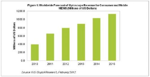 據IHS iSuppli公司的MEMS市場追蹤報告,由於蘋果iPhone和iPad去年第四季度創出最高銷量紀錄,2011年陀螺儀成為消費與移動MEMS領域中的創收大戶。