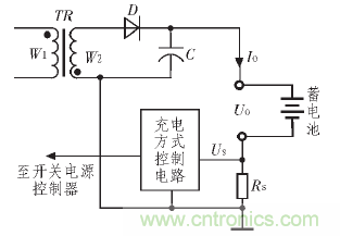 為(wei)了(le)提(ti)高(gao)開(kai)關(guan)電(dian)源(yuan)工(gong)作(zuo)的(de)可(ke)靠(kao)性(xing),防(fang)止(zhi)輸(shu)出(chu)電(dian)流(liu)過(guo)流(liu)等(deng)情(qing)況(kuang)發(fa)生(sheng),許(xu)多(duo)開(kai)關(guan)電(dian)源(yuan)在(zai)輸(shu)出(chu)端(duan)接(jie)入(ru)電(dian)流(liu)傳(chuan)感(gan)器(qi),檢(jian)測(ce)輸(shu)出(chu)電(dian)流(liu)的(de)大(da)小(xiao),一(yi)旦(dan)輸(shu)出(chu)電(dian)流(liu)超(chao)過(guo)設(she)計(ji)標(biao)準(zhun),保(bao)護(hu)電(dian)路(lu)即(ji)采(cai)取(qu)必(bi)要(yao)措(cuo)施(shi)保(bao)護(hu)開(kai)關(guan)電(dian)源(yuan)的(de)安(an)全(quan)[3]。此ci外wai,當dang開kai關guan電dian源yuan作zuo為wei蓄xu電dian池chi充chong電dian器qi時shi,也ye需xu要yao檢jian測ce輸shu出chu電dian流liu的de大da小xiao,以yi此ci了le解jie蓄xu電dian池chi的de充chong電dian情qing況kuang,適shi時shi切qie換huan充chong電dian方fang式shi,達da到dao提ti高gao充chong電dian效xiao率lv,延yan長chang蓄xu電dian池chi的de使shi用yong壽shou命ming的de效xiao果guo。圖tu3 為一個蓄電池充電器的輸出電流檢測原理圖, 電流檢測電阻RS將蓄電池的充電電流轉化為電壓US,反饋給充電方式控製電路,由控製電路根據充電電流的大小適時切換充電方式[4]。