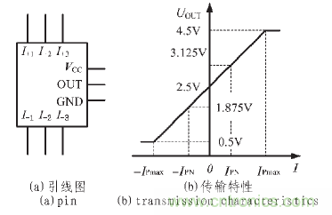 常用的TBC-DS 係列閉環霍爾電流傳感器的引線框圖和傳輸特性如圖5 所示[6]。圖5(a)所示的霍爾電流傳感器引線中,I+1~3和I-1~3是被測電流的串入繞組引腳, 其中,I+1和I-1是一個被測電流繞組的引腳,I+2和I-2、I+3和I-3也分別各是一個被測電流繞組的引腳。當3 個被測電流繞組並聯時,霍爾電流傳感器的額定測量電流為IPN1; 若將兩個繞組並聯再與一個繞組串聯時,霍爾電流傳感器的額定測量電流為IPN2;若將3 個繞組相互串聯時,霍爾電流傳感器的額定測量電流為IPN3。3 個額定測量電流間的關係為:IPN1=2 IPN2=3 IPN3。可見,通過3 組被測電流繞組的不同接法,可以改變霍爾電流傳感器的額定測量電流值,擴展測量區間。VCC為電源引腳,電源電壓通常為5 V;GND 是電源和傳感器輸出電壓的地;OUT 是傳感器電壓輸出引腳。由5(b)所示的霍爾電流傳感器傳輸特性可見,當被測電流為0 時,其輸出電壓UOUT =2.5 V;當被測電流不為0 且方向為從I+至I-時,輸出電壓UOUT>2.5 V,當被測電流不為0 且方向為從I-至I+時,輸出電壓UOUT<2.5 V。IPN和-IPN是霍爾傳感器的正負額定電流, 當被檢測電流達到額定電流時,根據電流方向的不同,輸出電壓UOUT 的值分別為3.125 V 或1.875 V, 即相對於2.5 V 的中心值有±0.625 V的偏移。當被檢測電流值絕對值大於IPN 時,霍爾傳感器仍可輸出與被檢測電流成線性關係的電壓值,直至被檢測電流達到霍爾傳感器的最大檢測電流IPmax。通常,IPmax>3 IPN。
