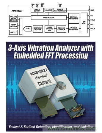 在一些應用案例中,相對簡單的傳感器輸出可能就足夠了,但在另一些應用中(例如,通過震動分析進行狀態監控),則需要增加相當多的處理過程才能實現所需的輸出。圍繞慣性傳感器而構建的一個高集成度器件示例是ADIS16227(見圖2),它是一款完全自治的頻域震動監控器。此類器件可能不提供相對簡單的g/mV輸出,而是提供特定應用分析。在本例中,其嵌入式頻域處理、512點實值FFT和片上存儲器能夠識別各震動源並進行歸類,監控其隨時間的變化情況,並根據可編程的閾值做出反應。