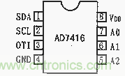 AD7416采用8腳表麵貼SO和8腳小型SOIC封裝形式,圖1所示為AD7416的引腳排列圖,各引腳功能如表1所列。