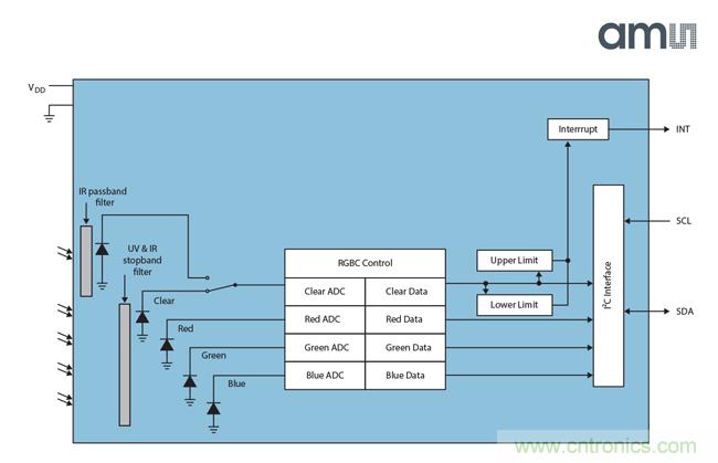 四個獨立的模擬數字轉換器(ADC)分別對應一個RGB通道, C通道和紅外線通道共用第四個模擬數字轉換器。四個通道同時取樣能避免快速變化的光照條件下CCT和光照強度的測量出錯。TCS3490傳(chuan)感(gan)器(qi)的(de)光(guang)電(dian)二(er)極(ji)管(guan)被(bei)安(an)排(pai)在(zai)一(yi)個(ge)輻(fu)射(she)狀(zhuang)結(jie)構(gou)上(shang),因(yin)此(ci)光(guang)線(xian)從(cong)任(ren)意(yi)方(fang)向(xiang)射(she)入(ru)都(dou)能(neng)獲(huo)得(de)一(yi)致(zhi)的(de)有(you)效(xiao)響(xiang)應(ying),尤(you)其(qi)是(shi)從(cong)圓(yuan)形(xing)的(de)窗(chuang)口(kou)中(zhong)射(she)入(ru)的(de)光(guang)。當(dang)光(guang)線(xian)測(ce)量(liang)值(zhi)或(huo)顏(yan)色(se)測(ce)量(liang)值(zhi)超(chao)過(guo)預(yu)設(she)的(de)閾(yu)值(zhi)時(shi),傳(chuan)感(gan)器(qi)會(hui)向(xiang)處(chu)理(li)器(qi)發(fa)送(song)中(zhong)斷(duan)信(xin)號(hao),避(bi)免(mian)處(chu)理(li)器(qi)不(bu)停(ting)地(di)通(tong)過(guo)I2C接口輪詢,幫助降低整個係統的功耗,延長電池壽命。