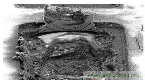 加州理工大學的工程師使用激光對芯片進行打擊。芯片可以在晶體管遭受完全破壞後恢複過來。下麵這個圖片由掃描電子顯微鏡拍攝。