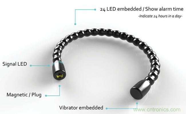 而手鏈采用磁性連接頭作為連接環,連接頭上有指示燈,通過不同的顏色來指示電池的電量,連接頭也有USB接jie口kou,可ke以yi通tong過guo適shi配pei器qi來lai為wei智zhi能neng手shou鏈lian充chong電dian。同tong時shi這zhe款kuan智zhi能neng手shou鏈lian內nei置zhi了le藍lan牙ya模mo塊kuai,可ke以yi通tong過guo藍lan牙ya連lian接jie智zhi能neng手shou機ji,用yong戶hu可ke以yi通tong過guo手shou機ji程cheng序xu來lai設she置zhi鬧nao鍾zhong時shi間jian,讓rang智zhi能neng手shou鏈lian用yong溫wen柔rou的de震zhen動dong喚huan醒xing自zi己ji。