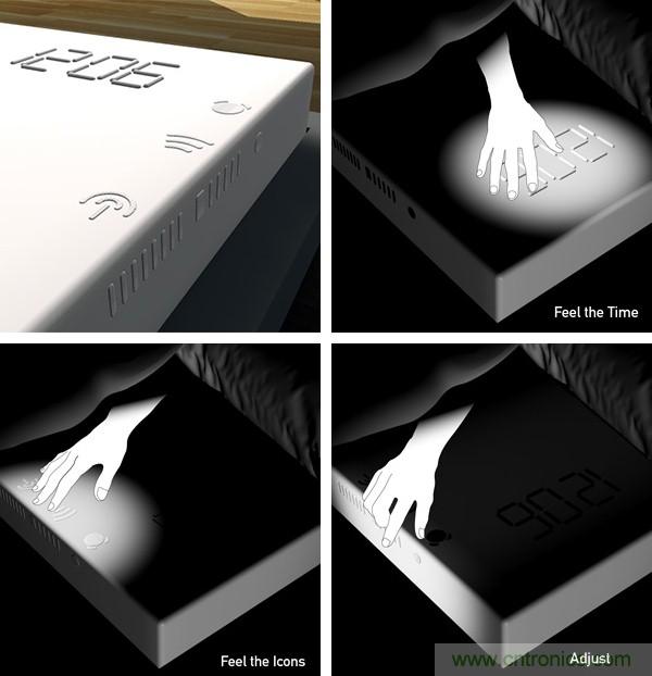 這個有趣的想法是將鬧鍾設計在床上,可以時間顯示、有鬧鍾開關、音量調節、功gong能neng設she置zhi等deng凸tu起qi按an鈕niu,它ta們men都dou被bei隱yin藏zang在zai床chuang單dan下xia麵mian,不bu必bi睜zheng開kai雙shuang眼yan,通tong過guo觸chu摸mo,我wo們men就jiu可ke以yi知zhi曉xiao和he調tiao節jie時shi間jian。這zhe些xie模mo塊kuai是shi采cai用yong一yi種zhong仿fang生sheng材cai料liao製zhi成cheng的de,這zhe種zhong材cai料liao又you被bei稱cheng為wei人ren工gong肌ji肉rou。它ta通tong過guo收shou縮suo或huo者zhe膨peng脹zhang來lai改gai變bian外wai形xing,從cong而er達da到dao變bian幻huan時shi間jian顯xian示shi數shu字zi的de效xiao果guo。