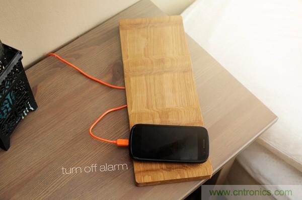 而Tangible Alarm的設計Tangible Alarm就像一塊長條形的木板,可以無線同步手機鬧鍾,通過簡單的移動手機,完成各種鬧鍾狀態的操作。Tangible Alarm共有三個移動的位置,包括小睡移動到右側、關閉移動到左側以及中間即是當前鬧鍾設置狀態。