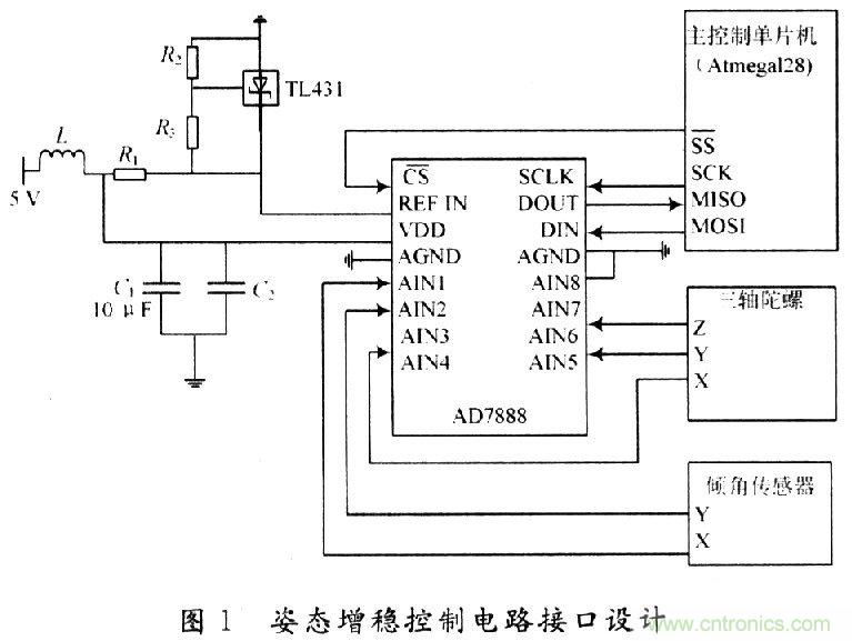 無(wu)人(ren)機(ji)內(nei)回(hui)路(lu)控(kong)製(zhi)作(zuo)為(wei)外(wai)回(hui)路(lu)控(kong)製(zhi)的(de)基(ji)礎(chu),對(dui)其(qi)能(neng)否(fou)穩(wen)定(ding)飛(fei)行(xing)起(qi)著(zhe)至(zhi)關(guan)重(zhong)要(yao)的(de)作(zuo)用(yong)。該(gai)係(xi)統(tong)中(zhong),內(nei)回(hui)路(lu)是(shi)由(you)三(san)軸(zhou)陀(tuo)螺(luo)和(he)傾(qing)角(jiao)傳(chuan)感(gan)器(qi)構(gou)成(cheng)的(de)姿(zi)態(tai)增(zeng)穩(wen)控(kong)製(zhi)回(hui)路(lu)。主(zhu)要(yao)由(you)主(zhu)控(kong)製(zhi)單(dan)片(pian)機(ji)、A/D采樣芯片、三軸陀螺儀和傾角傳感器組成。主控製單片機通過SPI串行總線與A/D采樣芯片相連,通過A/D采cai樣yang芯xin片pian獲huo得de三san軸zhou陀tuo螺luo儀yi的de角jiao速su率lv與yu傾qing角jiao傳chuan感gan器qi的de橫heng滾gun角jiao和he俯fu仰yang角jiao,然ran後hou進jin行xing姿zi態tai信xin息xi融rong合he,得de到dao無wu人ren機ji俯fu仰yang和he橫heng滾gun的de姿zi態tai信xin息xi。主zhu要yao接jie口kou連lian接jie情qing況kuang如ru圖tu1所示。