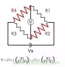 原理圖如上,當壓力變化時,電阻R1,R2,R3,R4發生變化,從而引發加載在電阻中間的電壓發生變化,這種變化反映出壓力值。
