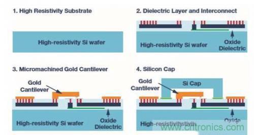 圖二中所示為利用MEMS技術製造開關的四個主要步驟。 該開關是以高電阻率的矽芯片(具有沈積在頂部的厚電介質層以提供與下方基板的優越電氣隔離)所建構。 使用了標準的後端CMOS內部鏈接製程實現與MEMS開關的內部鏈接。 低電阻率金屬與多晶矽都被用來製作與MEMS開關的電氣鏈接,而且都被嵌入至電介質層當中。