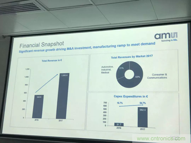 據介紹,艾邁斯半導體的營業收入去年到今年的增長用歐元計價是93%,用美元計算是100%。其中消費和通訊市場占了70%,這裏麵最主要的還是手機市場。另外31%是汽車、工業與醫療市場。而且,總體來說,兩邊的市場規模都增長得非常快。“為了進一步支持這個增長,我們在資本和研發的投資是非常巨大的。當然我們利潤增長也很高,大概74%,這也說明我們公司的盈利狀況也很好。” Everke說。