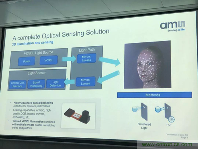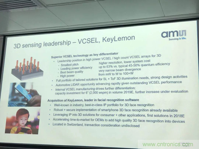 收購案例#2:艾邁斯半導體曾收購一家在做麵部識別軟件方麵特別強的企業KeyLemon,這家公司已有7年的曆史了,具備領先的3D人臉識別知識產權庫。同時,他們的軟件現在已經能在安卓係統中運行了。因此,艾邁斯半導體可以在消費類應用中提供可用於3D感應的軟件+硬件解決方案。“我們本身的傳感優勢,加上收購企業的技術,我們便可提供世界一流的完整解決方案。除了VCSEL之外,還有TOF(飛行時間)和結構光等,可以通過我們的傳感技術整合成一個完整的解決方案。” Everke指出。