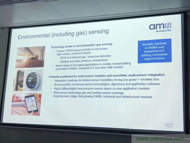 傳感器品類齊全也是艾邁斯半導體的優勢。另外,環境傳感器包括氣體、相對濕度、溫度、壓力和顆粒等監測的傳感器。這些傳感器不光可以用於移動設備行業、消費行業,還可以用於汽車市場、家居生活等。