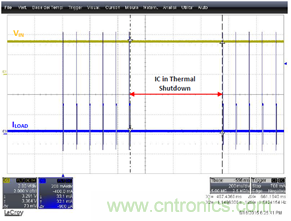 實驗未發現異常:封裝溫度最高值達到39.6°C。然後在Tamb=105°C下重複測試,驗證是否發生過熱關斷。