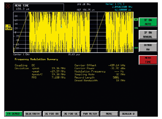 圖6是羅德與施瓦茨公司頻譜儀選件FS-K7在分析調頻信號的應用。它采用上述解調原理,可以實時解調調頻、調幅、調相和實時頻譜。