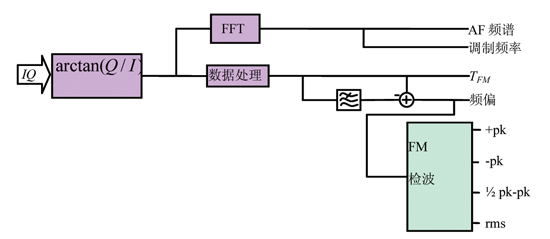 其中,Fm為輸入信號的頻率。對相鄰點相位差值對時間求導,得出頻率值。在測量時間內的所有Fm數值構成IQ幅度數組Fm-DC。