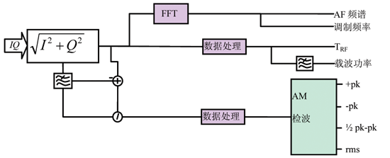 對此數組進行窄帶低通濾波,獲得載波幅度數組Vc ,計算AM-DC與Vc的差分數組,它與Vc的比值AMdeep 數組表述調製深度,對其進行檢波:正峰值 (+pk):數組中的最大值;負峰值 (+pk):數組中的最小值;峰-峰值/2 (1/2pk-pk):數組中的最大值與最小值差值的一半;均方根值 (rms):數組中數值的均方根值。