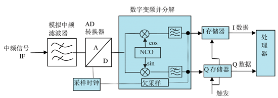 輸入頻譜儀的射頻信號經過混頻後變為中頻信號IF,再經過帶通濾波器(中頻濾波器)進入A/D轉換器。在數字處理部分,對下變頻為基帶的IQ信號進行低通濾波和欠采樣,存儲在內存中,準備進一步處理,存儲的數據表述IQ信號的電壓值。