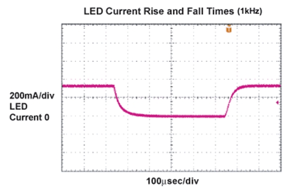 控製LED燈源亮度的最好辦法是通過一個低頻PWM脈衝調製LED電流。使用這種方法,LED電流根據占空比的變化觸發脈衝,同時保持電流幅度恒定。這樣,器件發出的光波波長在整個調節範圍內保持不變。