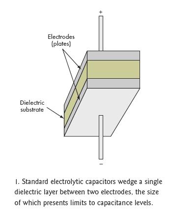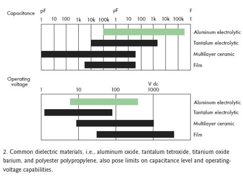 [page]標準電容的結構是在兩個附屬於金屬板上的電極之間夾一層電介質層(圖1)。根據電容類型不同,電介質可以是氧化鋁、四氧化鉭、氧化鈦鋇或聚丙烯聚酯,不同的材料決定了不同的容量和電壓特性(圖2)。電介質的多少和極板間的距離也會影響電容量。然而,極板間最大允許距離限製了電介質的數量。