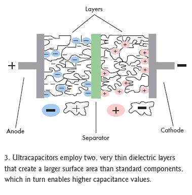 雙電層電容器(EDLC)正如它的字麵意義那樣可以解決上述問題,它在相同的封裝內增加了第二個電介層,這個電介層與第一層在中間隔離物的兩邊並行工作(圖3)。EDLC也采用無孔電介質,如活性碳、碳納米管、炭黑凝膠,並選用導電聚合物,其存儲容量要比標準的電解材料高出許多。額外層和更高效電介材料的這種組合能使電容容量提高近4個數量級。