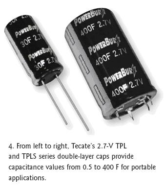 TecateGroup推出了具有多樣配置的多種PowerBurst品牌超級電容器。針對通用的脈衝電源、混合電池和便攜式產品應用,徑向引線的TPL和徑向折彎的TPLS係列雙層電容器分別具有0.5F到70F和100F到400F的容量(圖4)。這兩類器件的電壓額定值都是2.7V,工作溫度範圍是-40℃到65℃。TPL和TPLS係列的最大高度分別是45mm(100F)和60mm(400F)。
